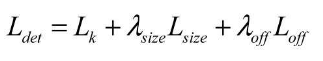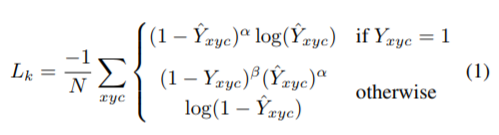 其中,Lk为关键点的损失,使用了Focal Loss的形式;Lsize为宽与高的预测损失,Loff为偏移预测的损失;Lsize与λoff是为了平衡各部分损失而引入的权重。