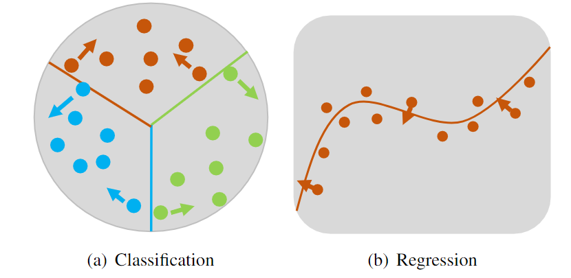 图1. 分类(a)和回归(b)的动态优化示意图。 每个实心点代表一个sample。 通过训练过程中学习到的一般知识,分类器和回归器在进行预测的同时,还存在缺乏灵活性的问题。模型应随着sample的变化而变化。图中箭头显示了为提高性能而进行的有可能的改进。