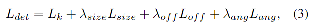 其中Lk,Lsize和Loff是中心点识别,尺度回归和偏移回归的损失,与CenterNet相同;λsize,λoff和λang是常量,实验中都设为0.1。