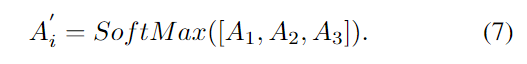 为了使神经元具有自适应的感受野,本文采用一种注意机制以position-wise方式融合特征。Xi首先送入一个注意块(由1×1的卷积,批归一化和ReLU组成)以获取注意图Ai(i∈1,2,3)。然后,在通道方向上对A进行concat,然后进行SoftMax操作以获得归一化的选择权重A'i: