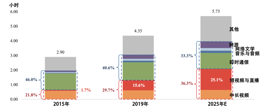 再看快手所在的短视频与直播行业,在整个互联网行业中所处的地位与前景。以日均在线时长占比为指标,2019年,我国互联网用户日均在线时长4.35个小时,短视频与直播约占15.6%。到2025年,日均在线时长将延长到5.73个小时,短视频与直播的占比则会提升到25.1%。