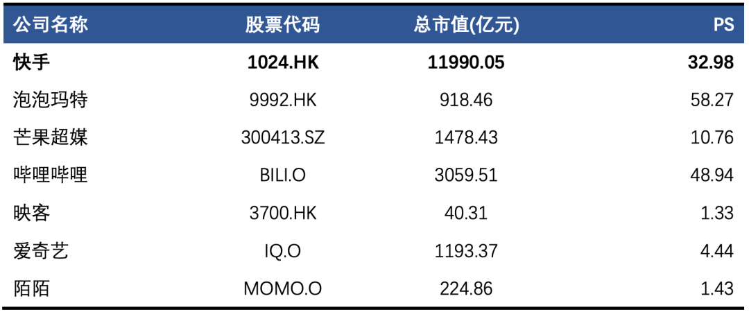 表1:快手与可比公司估值PS,截止2月9日收盘
