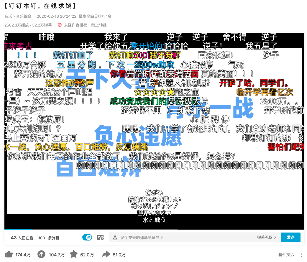 企业和年轻人对话,想要效果好,还得用年轻人喜欢的方式。今年年初因大量一星评价,钉钉迅速在 B 站推出了鬼畜视频《钉钉本钉,在线求饶》,获得大量转发互动,登上各大社交媒体热榜,而目前该视频播放量已经达到了 2500 万,这在 B 站十分少见。