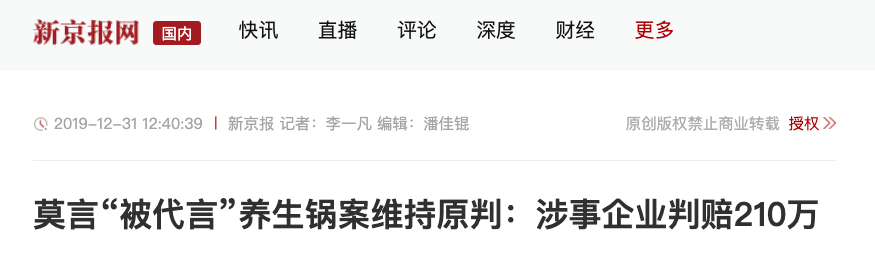 根据新京报报道,诺贝尔文学奖得主莫言就曾经「被代言」,深圳玉瓷公司使用了莫言的照片、书法作品等推广自家产品,但双方并未达成合作。