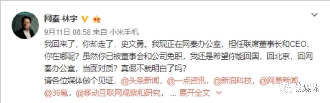 9月11日,林宇又在微博上喊话史文勇,“我回来了,你却走了,史文勇。我现正在网秦办公室,担任联席董事长和CEO,你在哪呢?虽然你已被董事会和公司免职,我还是希望你能回国,回北京,回网秦办公室,当面对质?真假不就明白了吗?”