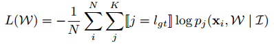 图1展示了我们CNN的架构, 这个网络遵循这编码-解码的设计. 语义标签集可以定义为 L = {1, 2, ..., K}, 按照惯例, 我们计算在x处分类的得分S = (s1, s2, ..., sk), 网络推断图像中所有像素x为标签j的概率为: