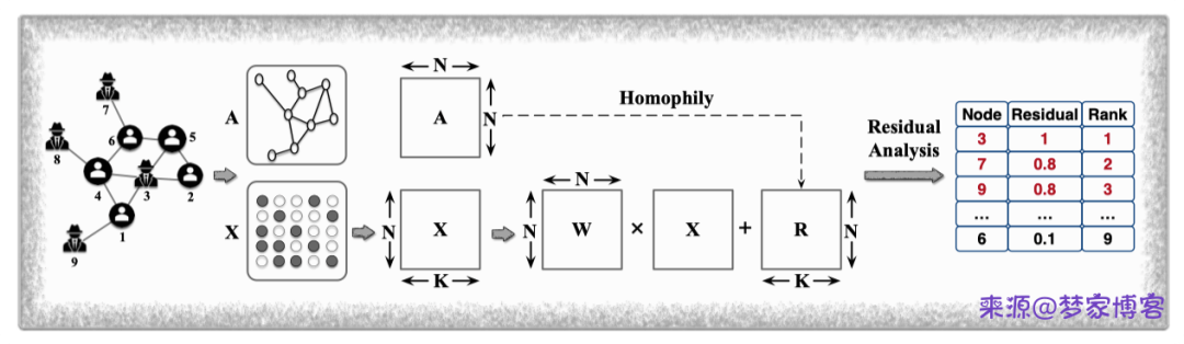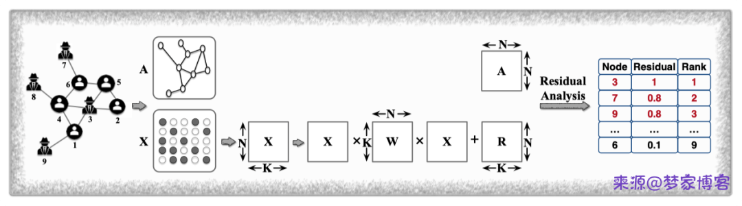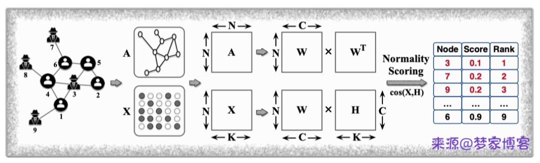Accelerated local anomaly detection 主要检测社团异常点,主要基于非负矩阵分解的方法计算节点属性特征的相似性来判定节点异常程度。主要架构如下所示