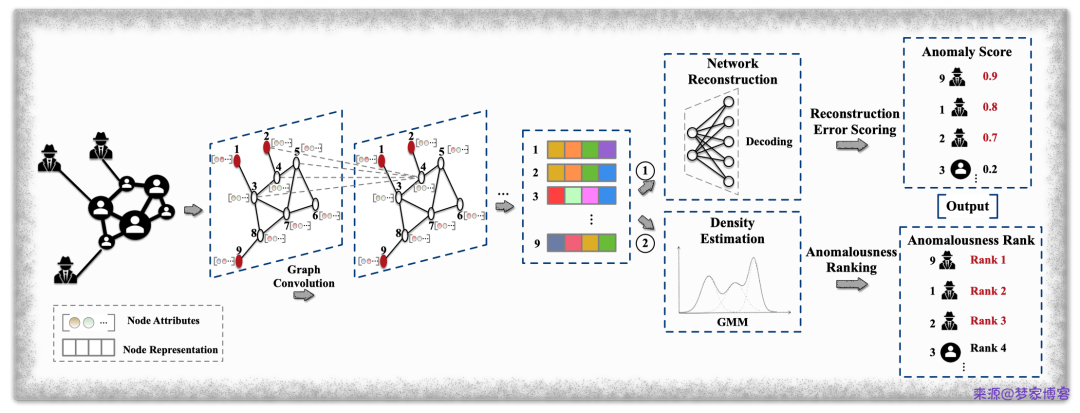 基于高斯混合模型 GMM 来检测全局异常点和社团异常点,利用节点表示来估计 GMM 参数,而且异常节点对应的 GMM 概率较小。