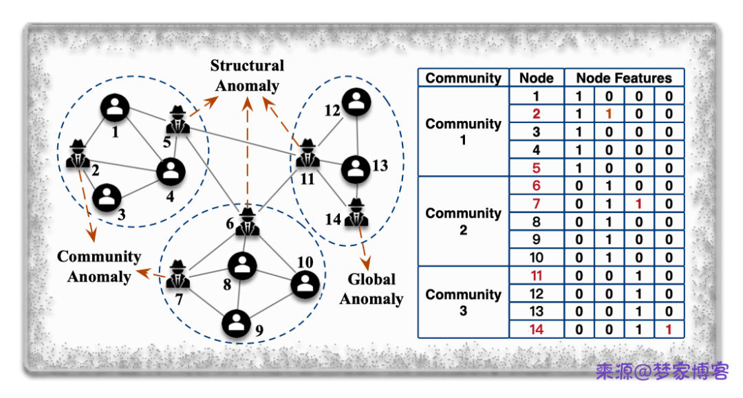 针对静态图中的异常节点检测,主要从节点或者边属性进行区分。异常节点主要可以分为以下三种类型: