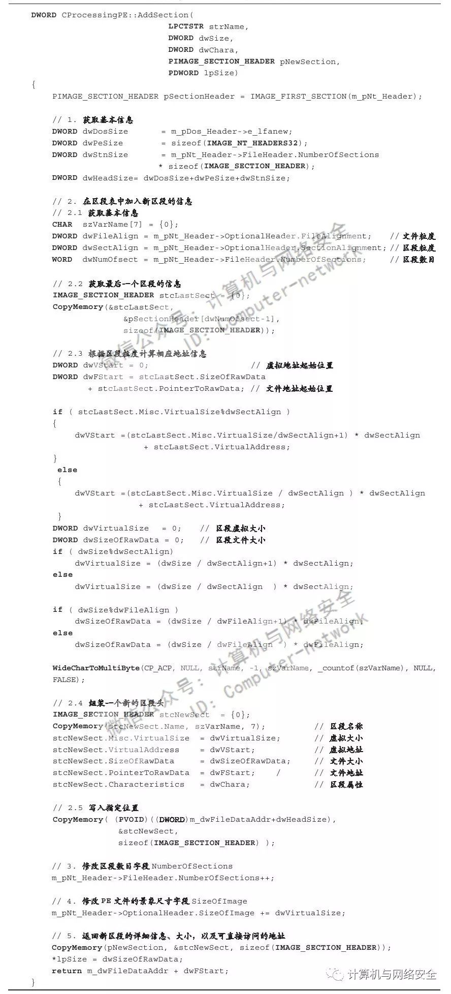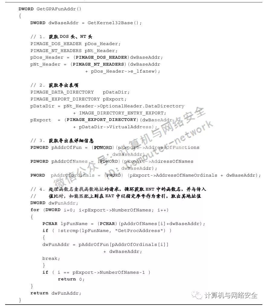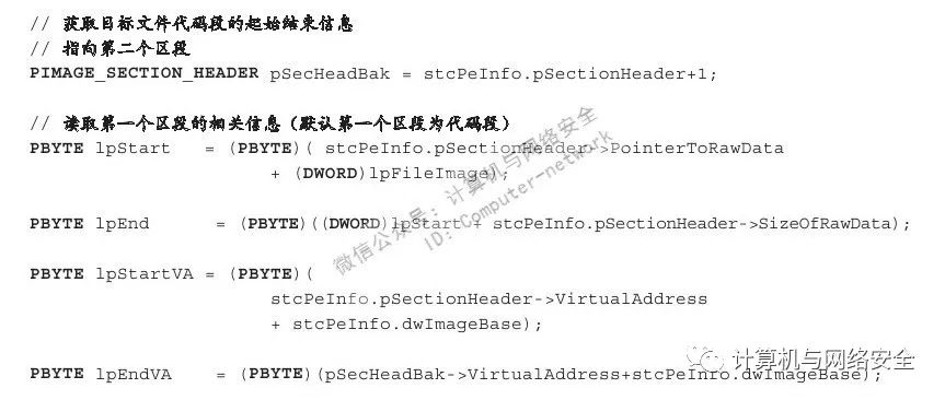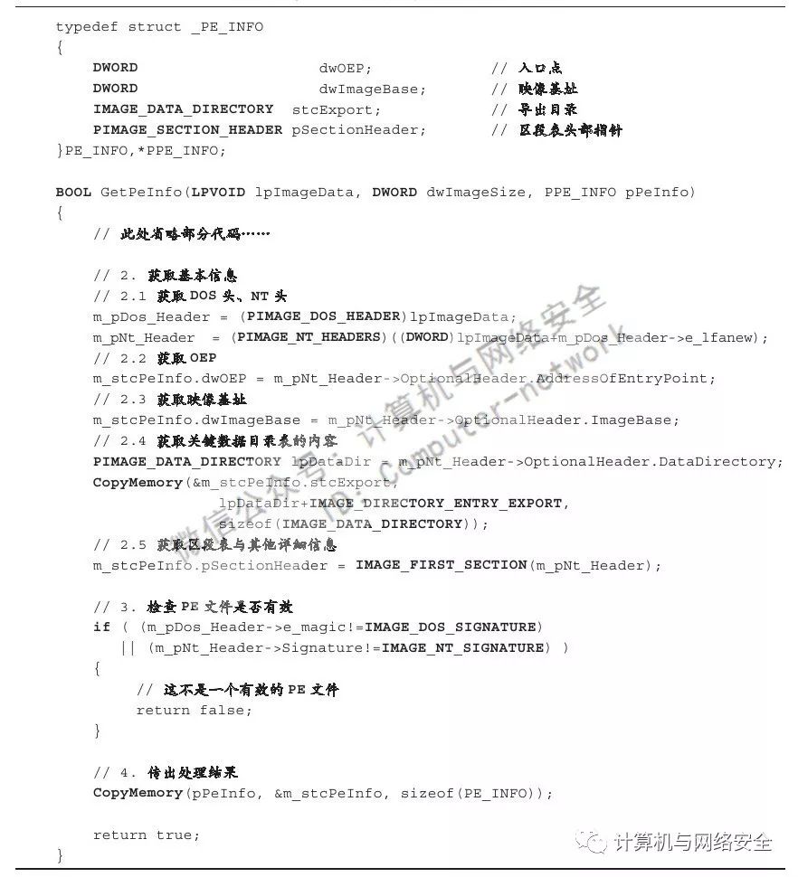 对于以上代码需要注意的是,某些变量如代表PE结构中NT头指针的pNtHeader与代表Dos头指针的pDosHeader等变量出于篇幅考虑,其来源并未给出。但是我们可以根据变量名简单地猜测其用途,这并不影响我们理解整段代码的意思。