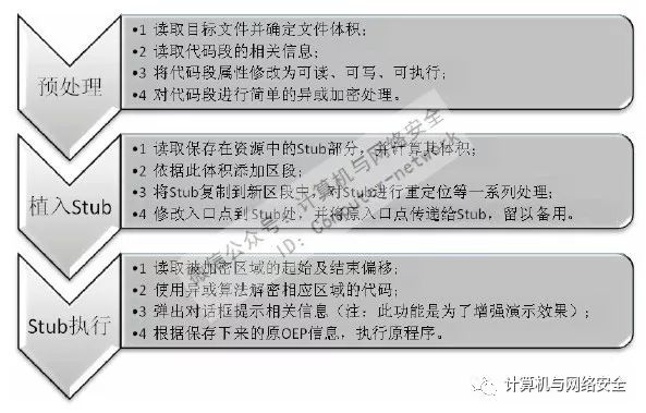 最后,修改宿主程序的入口点信息,使宿主程序在运行时先执行Stub部分的代码,并修改新区段中的配置信息,使Stub部分的代码在完成工作后会跳转到真正的宿主程序入口点处,执行宿主程序。
