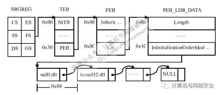 获取kernel32.dll加载基址的公开方法目前有3种:一种是通过特征匹配的暴力搜索;另一种是利用系统的SEH机制找到kernel32.dll并搜索出加载基址;最后一种则是通过线程环境块TEB的信息逐步找到kernel32.dll的加载基址。在以上3种方法中,代码量最少的就是最后一种方法,这也是我们将要介绍的方法。应用这种方法的具体思路如下: