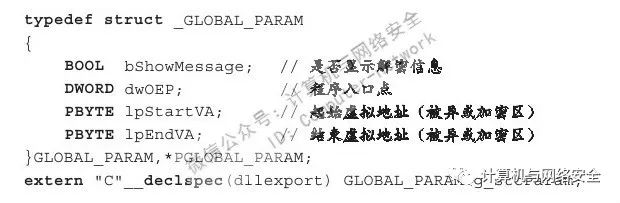 通过以上代码可知,我们定义了一个名为GLOBAL_PARAM与PGLOBAL_PARAM的结构体类型,并用GLOBAL_PARAM类型定义了一个被导出的全局变量g_stcParam。