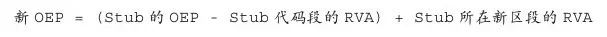 但是在最后计算OEP的过程中,要注意Stub的PE文件中所保存的OEP不能直接拿来用,因为Stub的代码段被移动了位置,其RVA已经发生了变化。因此将这些因素考虑进去后,我们可以得出以下公式: