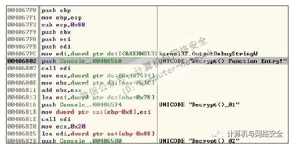 从图10中可以看到,除了函数入口处的"Decrypt()Function Entry!"提醒我们已经进入Decrypt函数外,还有Decrypt()_01等标记函数中的关键点,这样我们就能迅速地在反汇编代码中定位到关键点,从而使我们的调试工作更加轻松可靠。