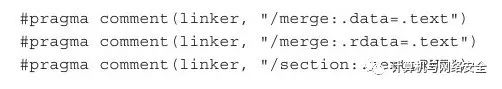 以上代码的前两行的意思是将.data、.rdata这两个区段合并到.text区段中,第三行的意思是修改.text区段的属性为可读、可写、可执行。