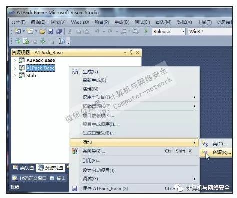 然后在Visual Studio的资源选项卡中选中A1Pack_Base项目,并右击,在弹出的菜单中选择“添加”→“资源”,如图4所示。