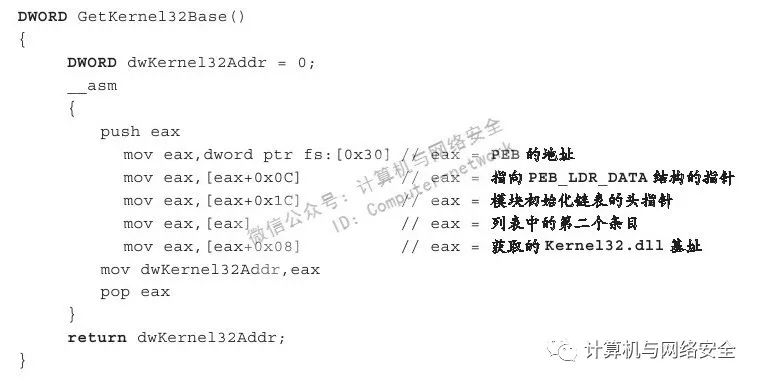以下是获取kernel32.dll基址的代码。