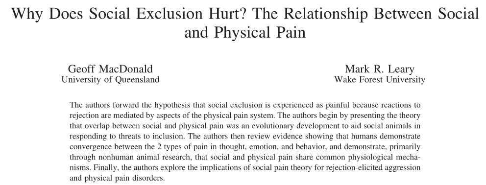 在这篇论文中,作者用社交疼痛这个术语,来指代一个人被排斥在理想的关系之外,或者被理想的关系伙伴或群体贬低时,产生特定的情绪反应,并提出了一个假设:社会排斥之所以痛苦,是因为被排斥的反应是由身体疼痛系统的各个方面调节的。