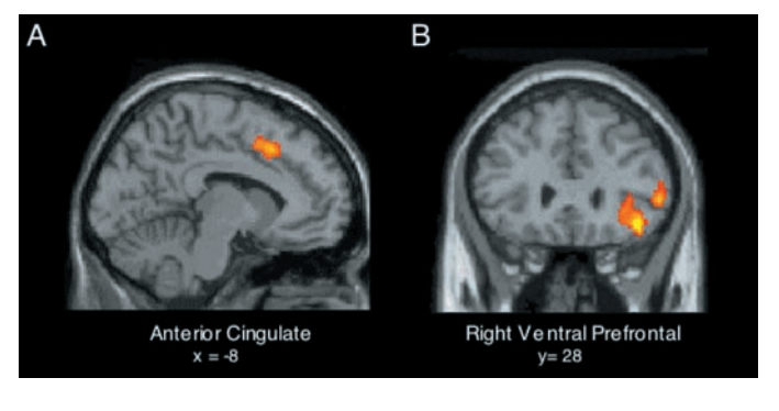因此,作者得出结论,参与处理风险和恐惧的右腹侧前额叶皮层(RVPFC, right ventral prefrontal cortex)通过扰乱 ACC,以帮助调节社会排斥的痛苦。
