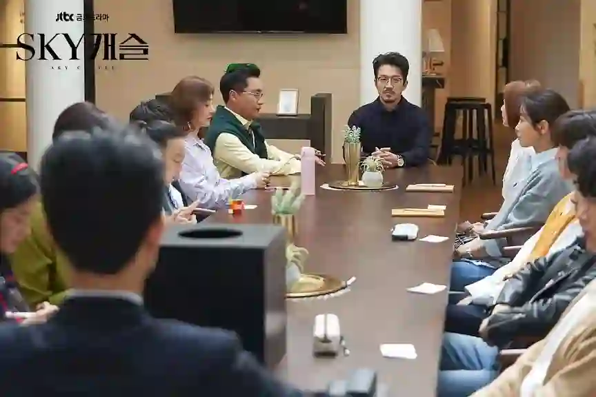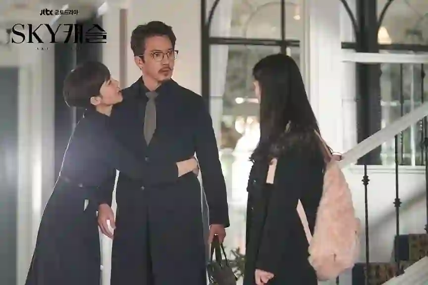 《天空之城》中的男性角色似乎是一个点缀,但是他们从另一个角度呈现了整个东亚社会(韩国、日本、中国)的男性社会典型——他们相信门第、家世、世袭,这也让他们在教育子女的过程中,更信奉东亚教育体系,一切目标都以考入著名大学为基准。他们发自内心认为,只有进入最好的大学,才具备进入上圈社会的资格。