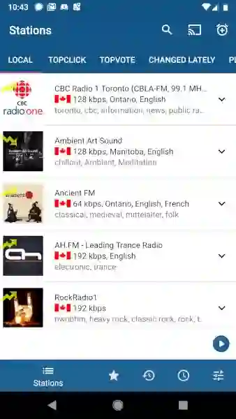 安装过程快速顺利,RadioDroid 打开展示当地电台十分迅速。你可以在这个屏幕截图的右上方附近看到 Chromecast 按钮(看上去像一个有着波阵面的长方形图标)。