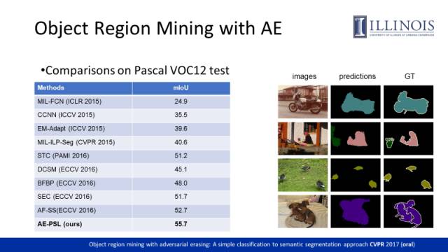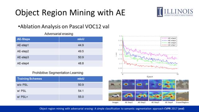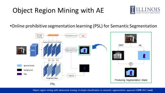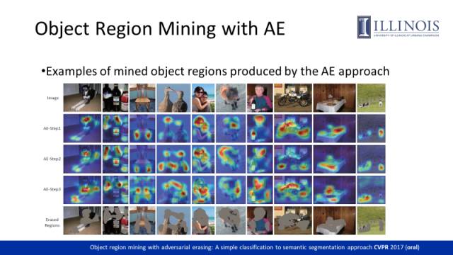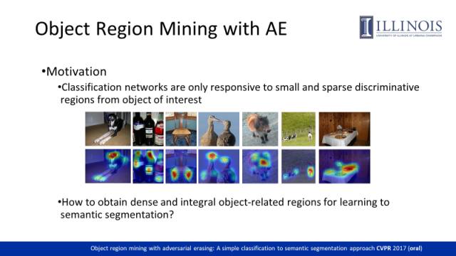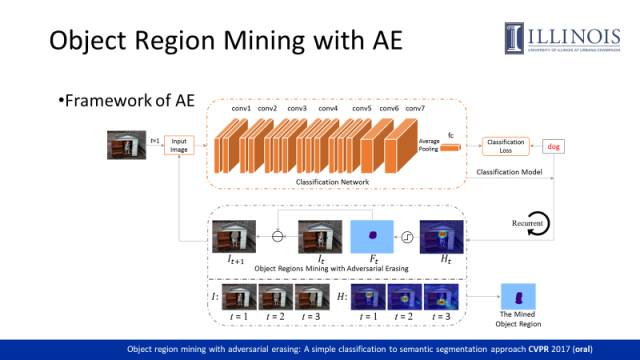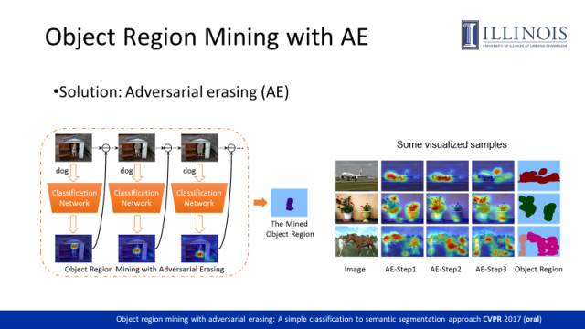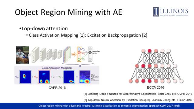 这是我们在CVPR17上的一篇工作,Object Region Mining with AE(Adversarial erasing),通过Adversarial erasing的方式去挖掘出更多的object related region。