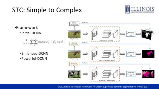 我们利用I-DCNN对训练样本做预测,同时又根据image-level label剔除一些噪声,由此可得到针对简单图片的segmentation mask,进而基于预测出来的segmentation mask,按照全监督的卷积神经网络通用的损失函数去训练一个Enhanced DCNN(E-DCNN),进一步提升网络的语义分割能力。