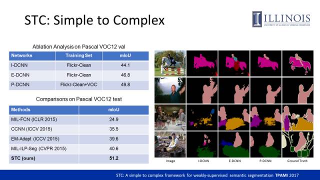 如图左上角表格,我们用Pascal VOC对三个深度卷积神经网络的分割能力做了测评,mIoU值代表了分割性能。只用I-DCNN,mIoU值达到44.1%,通过E-DCNN后,mIoU值达46.8%,当再通过P-DCNN后,我们的性能进一步增强可以达到49.8%。右图是经过各阶段卷积神经网络的预测结果的对比图,可以看出分割的结果也是越来越好。这篇工作在2015年投稿,当时比其他方法性能高出了10个点。