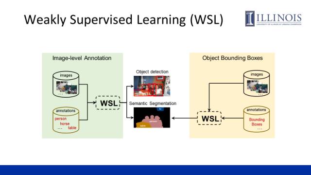 我们所关注的弱监督问题是指为实现某个计算机视觉任务,采用了比该任务更弱的一种人工标注作为监督信息。一般来讲,这种弱监督的标注比原始的标注更容易获取。例如,对于目标检测任务,image-level(图像层面)的标签相比物体的bounding box是一种弱监督的标注;对于语义分割任务,image-level的标签和物体的bounding box相比pixel-level(像素层面)的标签则是一种弱监督的标注。