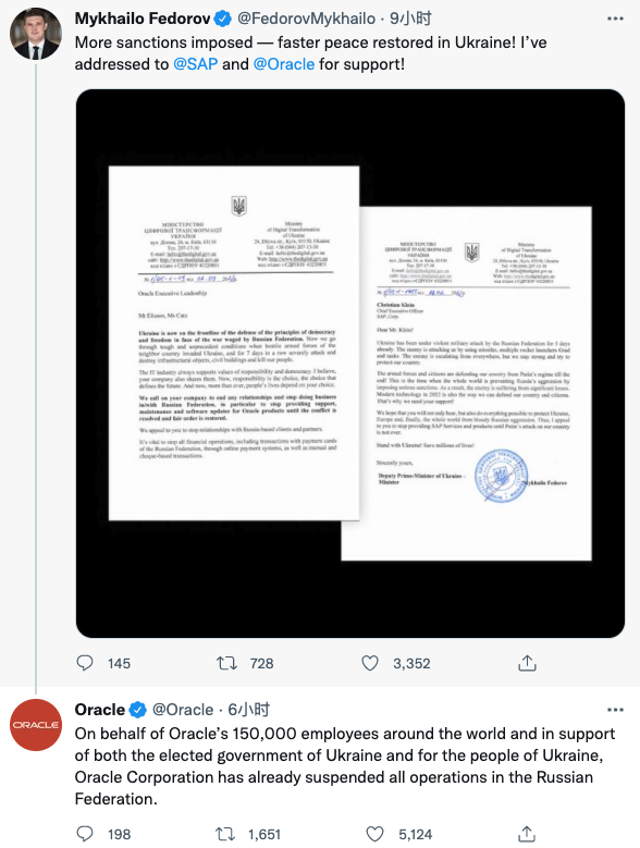 随后,Oracle 在三小时内就回复了乌克兰的请求,Oracle 表示已经暂停了在俄罗斯的所有业务。