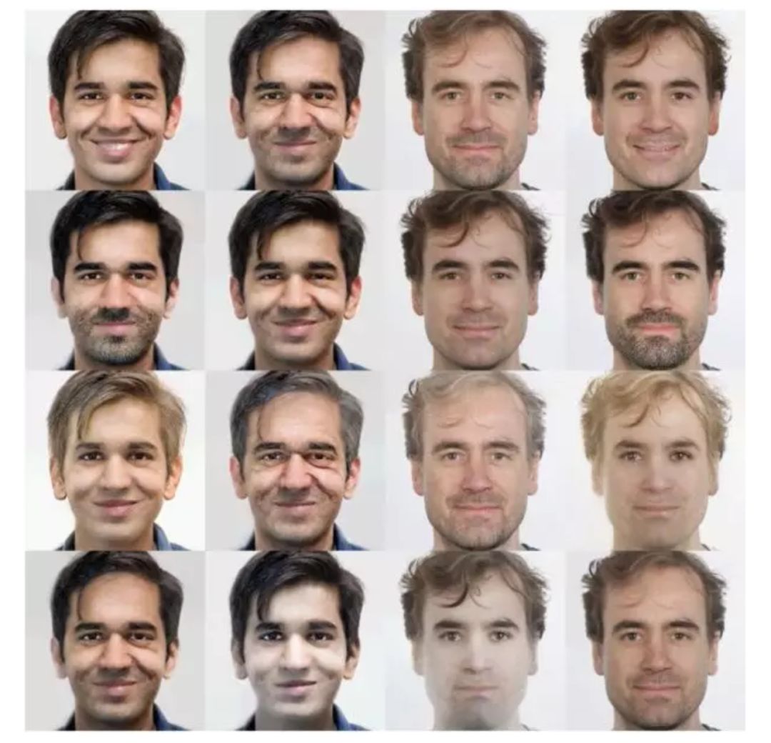 图丨 Glow 对两名研究人员脸部图像的属性操作。训练过程中,模型没有提供眼睛、年龄等属性标签等情况下,自己学习潜在空间,部分特定方向对应胡须密度,年龄,头发颜色等属性的变化。