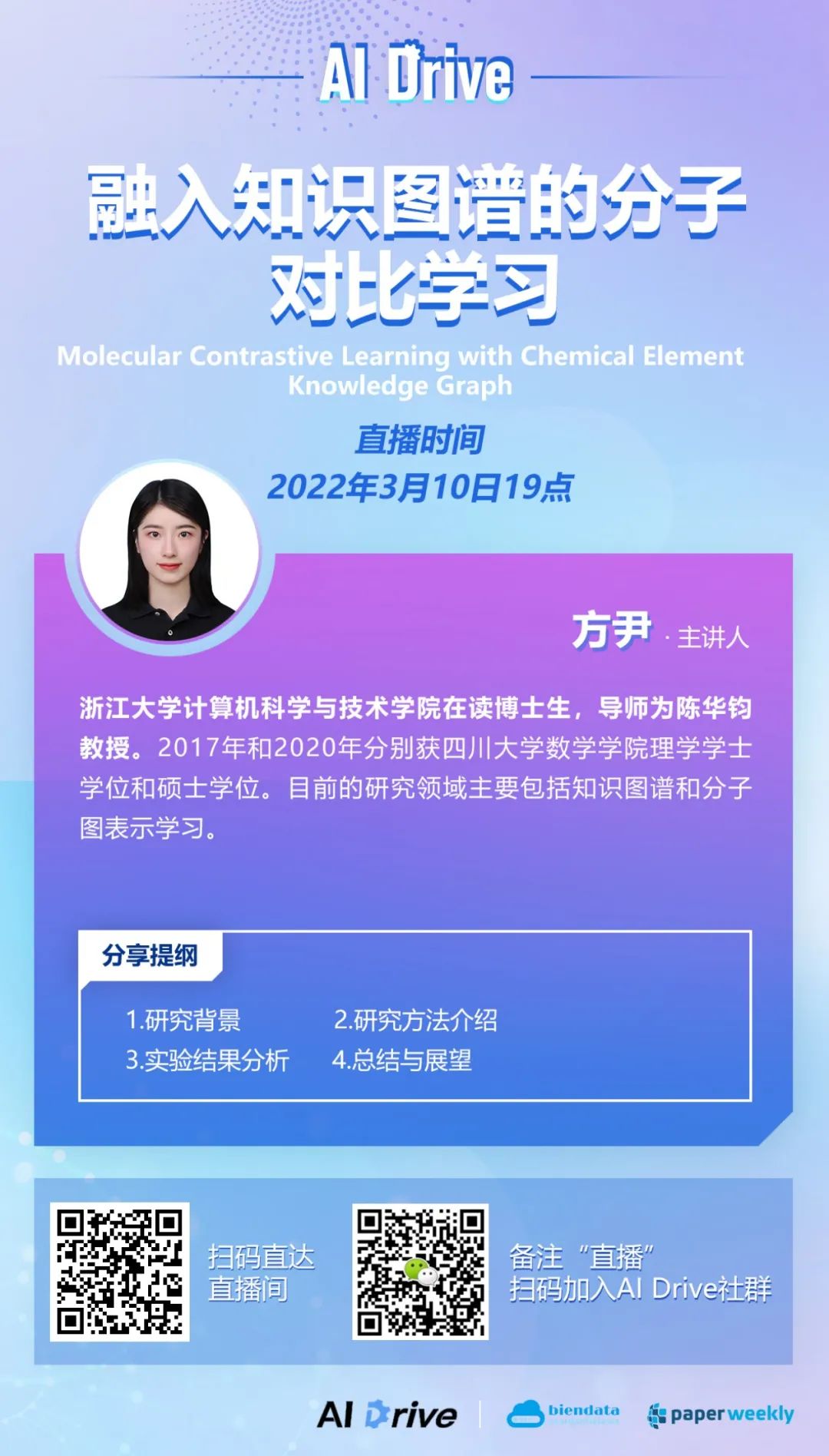 本期 AI Drive,我们邀请到浙江大学计算机科学与技术学院博士生方尹,为大家在线解读其发表在 AAAI 2022 的最新研究成果:Molecular Contrastive Learning with Chemical Element Knowledge Graph。对本期主题感兴趣的小伙伴,3 月 10 日(本周四)晚 7 点,我们准时相约 PaperWeekly 直播间。