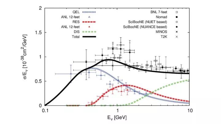 例如从上面的图像中我们可以读出,在10 GeV的能量下,最可能出现的结果就是由绿线代表的深度非弹性散射(deep inelastic scattering),其次是红线标记的共振态(resonance state),最后是蓝线表示的准弹性事件(quasi-elastic event),黑色曲线表示的则是总截面的值,误差条显示了对每个测量精度的估算。