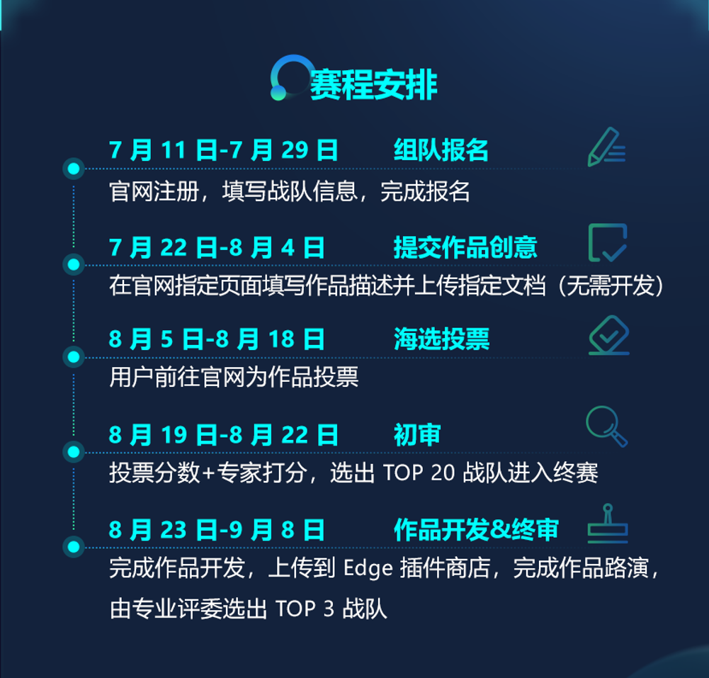 大赛由 Microsoft Edge 浏览器团队操办,Microsoft Edge 浏览器作为一个年轻的、朝气蓬勃的浏览器,始终期待着新鲜血液的涌入和年轻思维的碰撞。于是,在这个后疫情时代,Microsoft Edge 首届校园插件大赛邀请高校学生,共同在 Microsoft Edge Add-ons 这个平台上释放创意的火花,共同探索这个世界的“Edge”。现在,大赛进入报名倒计时阶段,感兴趣的同学们快快进入官网报名吧!