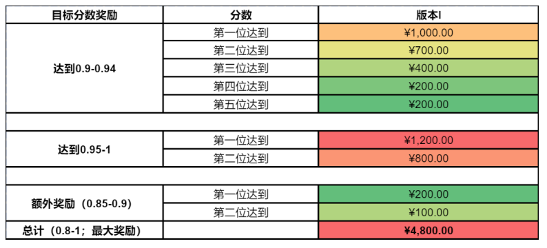 *举个栗子:A开发者在参加本榜时是第1位分数抵达0.8-0.9阶段,可拿走200块;冲刺后又是第1位分数到0.9-0.95,可拿走1000;再冲刺又是第1位达0.95以上的开发者,拿走1200,一共可以拿走200+1000+1200=2400元,其他抵达相应分数的开发者依据表格领取即可。