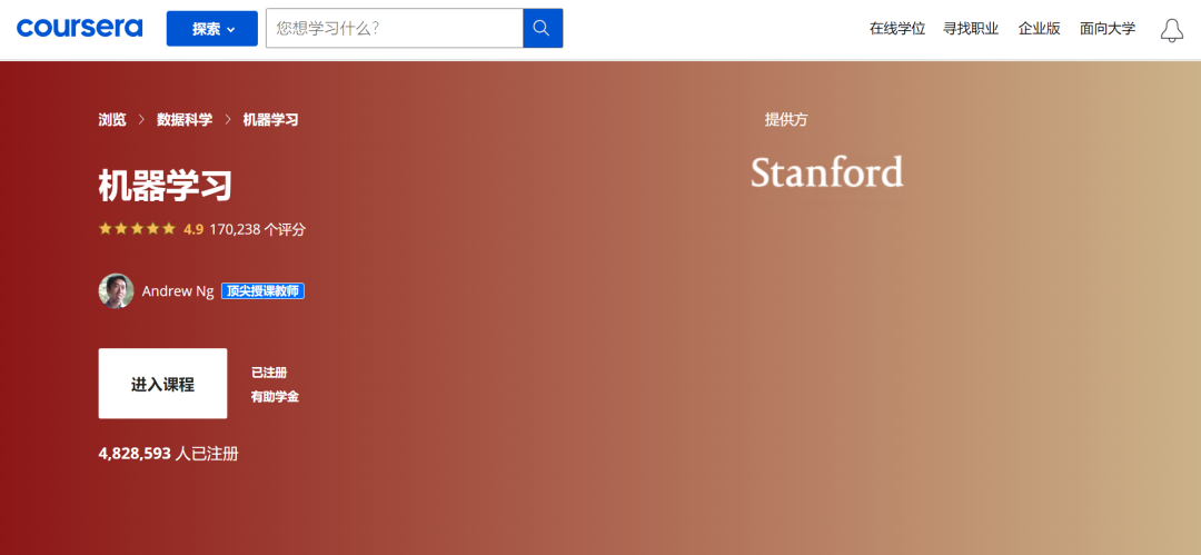 要说人工智能领域的课程,斯坦福大学客座教授吴恩达的《机器学习》(Machine Learning)堪称经典。该课程最开始于 2012 年在 Coursera 上线,十年间已经吸引了近 500 万人注册。