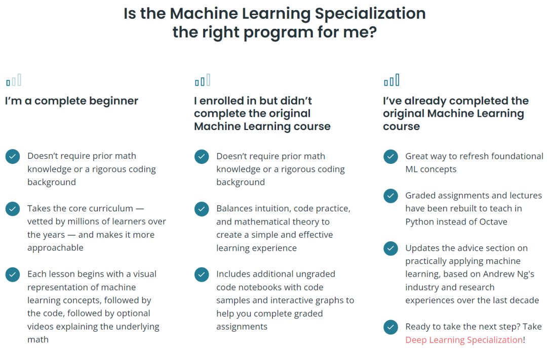 课程页面显示,「Machine Learning Specialization」是经过重新改进的,新课程比以往版本更具相关性(more relevant than ever),新课程扩展出了 3 门课程,可以满足不同人群的需求。