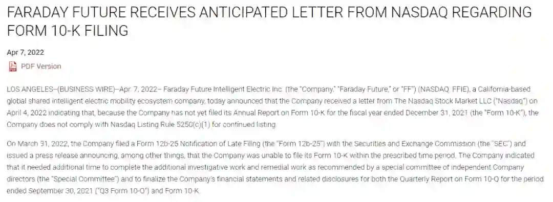 上周7日,FF发布公告表示,其已在2022年4月4日收到来自来自纳斯达克的通知信函,通知中表明由于其尚未及时提交截至2021年12月31日的10-K年度报告,违反了纳斯达克上市规则第5250(c)(1)条。