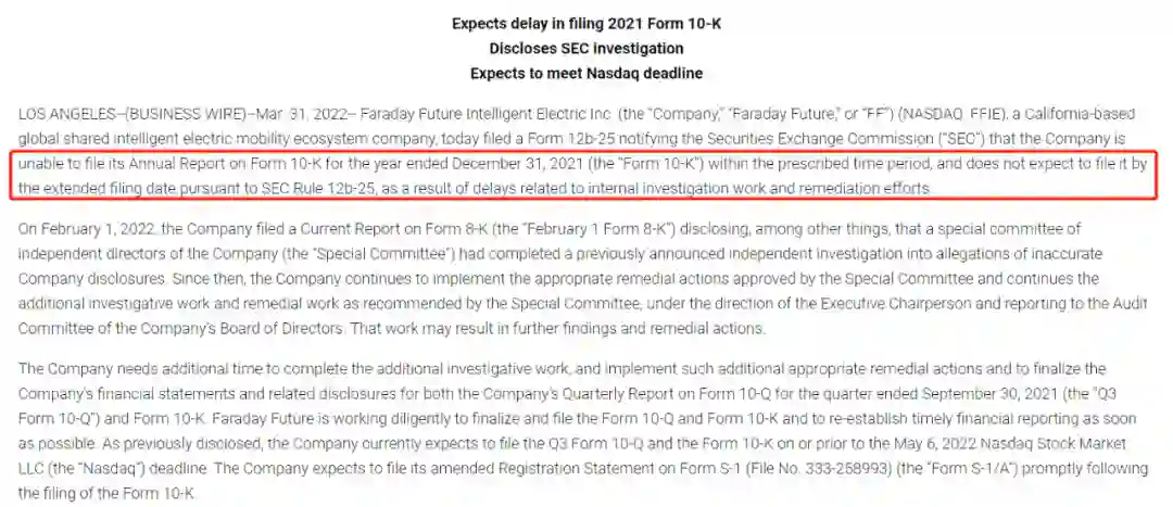 FF会收到这一通知,并不令人意外。上月底,FF就向美国证券交易委员会(SEC)提交了一份名为“提供有关申请和调查状态的最新信息”的公告,在公告中其表示无法在规定时间内提交2021年第三季度及全年财务数据。