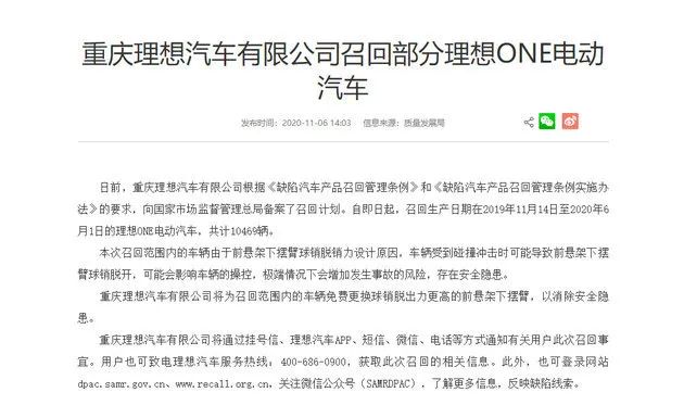据国家市场监督管理总局显示,日前,重庆理想汽车有限公司根据《缺陷汽车产品召回管理条例》和《缺陷汽车产品召回管理条例实施办法》的要求,向国家市场监督管理总局备案了召回计划。自即日起,召回生产日期在 2019 年 11 月 14 日至 2020 年 6 月 1 日的理想 ONE 电动汽车,共计 10469 辆。