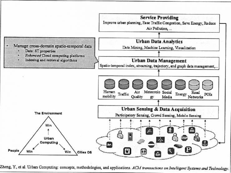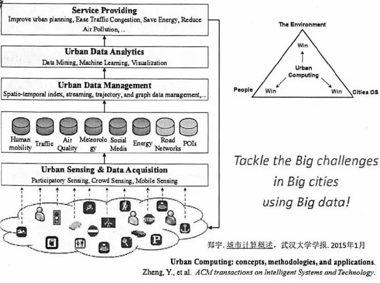 大家都知道我们现在生活越来越现代化,但是问题越来越多:交通拥堵、环境恶化、能耗增加。要解决这些问题在很多年前看似几乎不可能,因为城市设置非常复杂,环环相扣,牵一发而动全身,现在由于有了各种传感器技术的成熟和云计算单元的成熟,使得我们有各种各样的大数据,从社交媒体到交通流量,从气象条件到地理信息,如果使用得当的话,我们就能够用这些数据来发现城市面临的问题,并进一步通过组合这些数据来解决我们面临的挑战。基于这样的机遇和挑战,我们在2008年就提出了城市计算这样一个愿景,包括以下四个层面:从下往上(下图)有城市感知数据获取,城市数据的管理,城市数据的分析和挖掘到最后服务的提供。