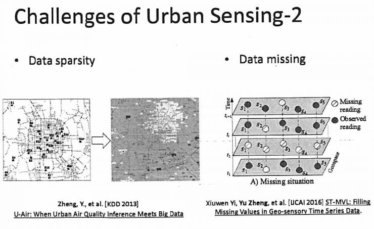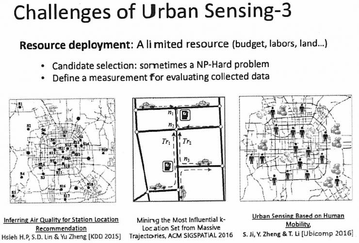 如何用有限的资源做更多的事情,采更多的数据,如何利用限的资源获得更大的感知效果,这是非常困难的。为什么困难?两个原因,第一,我们有很多候选集可以选,从很大的数据集里面选一部分数据的时候,往往是一个NP的问题。比如,我们城市那么大,每个路口都可以布充电桩或者加油站,而我只有钱布2到3个充电桩,我应该放在什么位置,使得效果最大化。这就是一个maximum coverage的问题。还有一个原因会导致问题更难,即我们根本不知道Ground Truth。假设北京已经有两个空气质量监测站点,我们还要建4个,我们要放在什么地方使得空气质量感知最大化,你没有建站点之前不知道这个空气质量多少,根本不知道什么叫好、什么叫坏,这是难点,里面都有相关的论文去解决这样的问题。