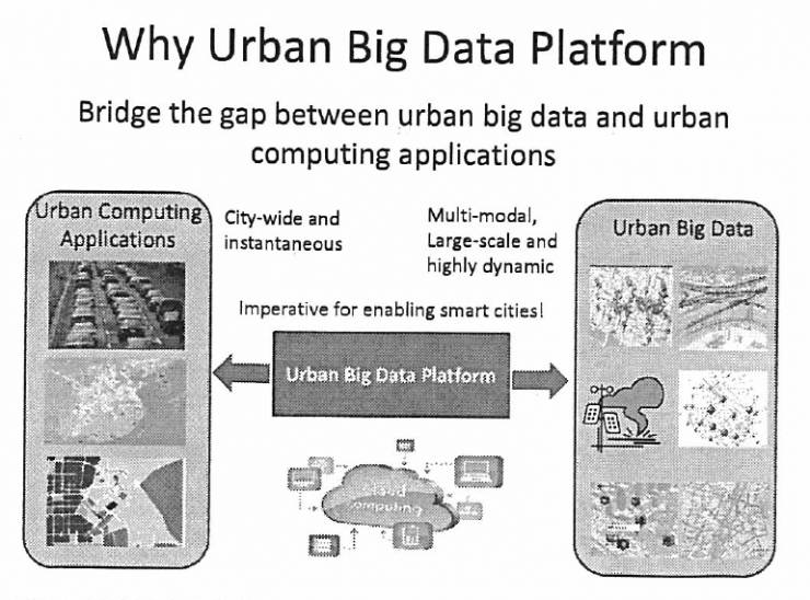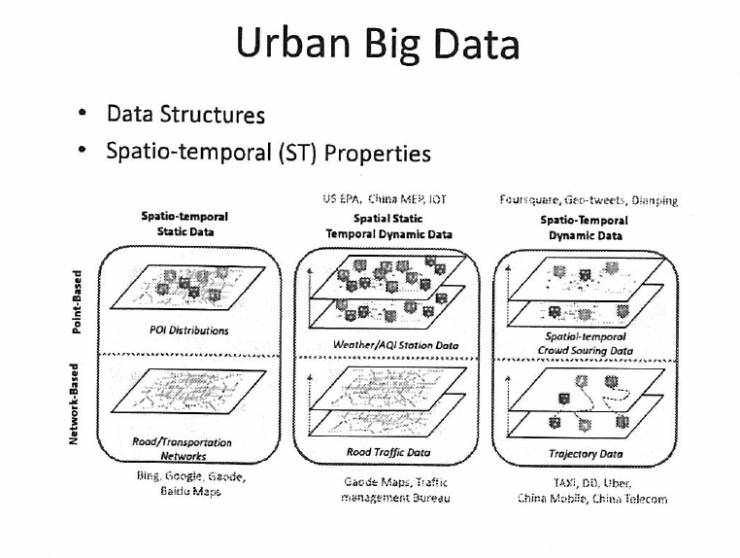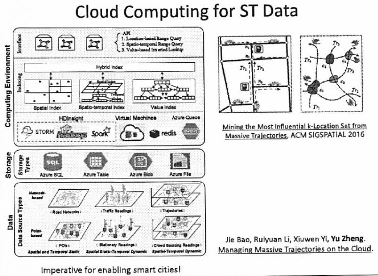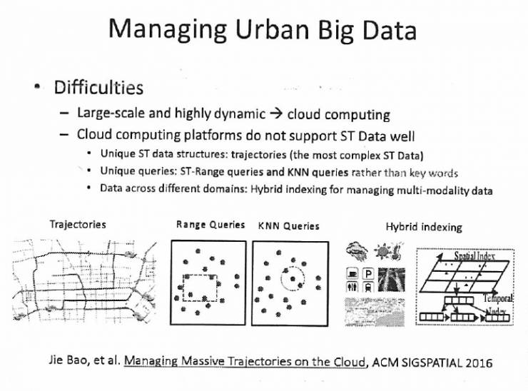 回到我们的城市计算第二个层面,刚刚讲了城市感知层面,我们要看城市数据管理。要管好城市大数据就是三方面的东西,第一,时空数据,这是时空的属性,不是一般的文本,也不是视频。第二,就是这种增强性的云平台,不是普通的云平台。第三,时空的索引,就是查询和检索算法。