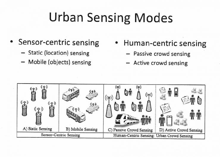 另外一个,以人为中心的感知,这是比较新的概念,也叫群体感知,这里面也分成两个方面,一个叫做被动式群体感知,一个叫主动式群体感知。被动式群体感知,每天每个人都在参与,我们并不知道我们打电话的时候,我们的数据可以拿去改进通话网络的质量;我们并不知道我们公交车上下车刷卡的时候,这个数据可以帮助优化我们的公交线路,改进城市规划。把每个人的数据收集在一起,感知城市的变化,最后解决问题,这叫做被动式群体感知。主动式群体感知就是,任务是什么很明确,什么时间、什么地点、干什么事情、共享用什么数据,这个数据拿来干什么用都很清楚,甚至还有激励机制,你可以选择什么时候加入或不加入。这是目前城市数据来源的四种方式。