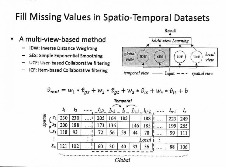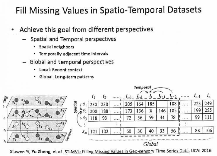 我们怎么做呢?我们基本上就是利用缺失点时序以及空间邻居的数据,一起来把这个数据填满,而不是仅仅只看自己的时间临近值。至于怎么用、怎么填是有讲究的,是用前一小时的数据还是用周边的数据,这个其实是比较难决策的过程。