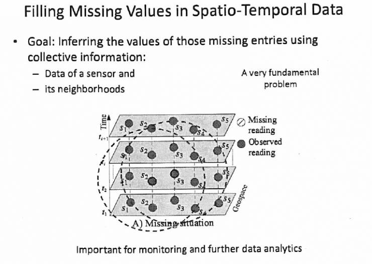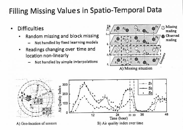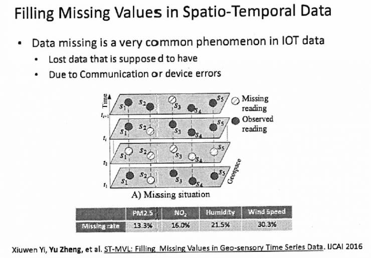 第二个,偏理论的例子。我刚才说数据会缺失,要填补,怎么填补?这是一个非常基础的问题,几乎我们做所有的机器学习的人在第一步拿出数据的时候会发现,这个数据质量不好,有一些缺失。可能传感器坏了,或者数据没传过来。我们拿的很多数据都是有缺的,气象数据有缺的,空气质量有缺的,甚至包括车联网里面数据很多都是会出现残缺的,怎么填?这是一个很重要的问题。