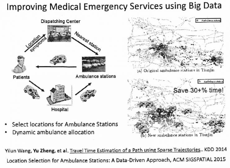下图是天津市的一个救护车站站点的分布图。以前站点的选址,可以说基本上是拍脑袋决定,比如根据一个地方大概的总人口数、路网密度来布置站点。大家知道120的需求量跟人口数并不一定成比例,还跟人的身体健康状况、年龄结构有关。现在我们有了真实的120求救数据,我们知道什么时间、什么地方,有多少人求救。以及救护车在急救过程中他们的GPS轨迹、花了多少时间,通过我们的方法、算法重新对站点的位置选址和布局,使得救护车救这么多病人平均抢救时间最小化。通过我们的算法重新选址后,我们能够把抢救时间缩短30%。比如,以前救100个病人假设花100个小时,现在只需要花70个小时,还是那么多车、还是那么多站点,我们却能更快地把病人送到医院。把时间节约下来留在在手术室抢救病人的生命,这是人命关天的事情,是资源调度优化的问题。这个站点如何部署就很有讲究了,你放的好和不好就会有很大的区别。