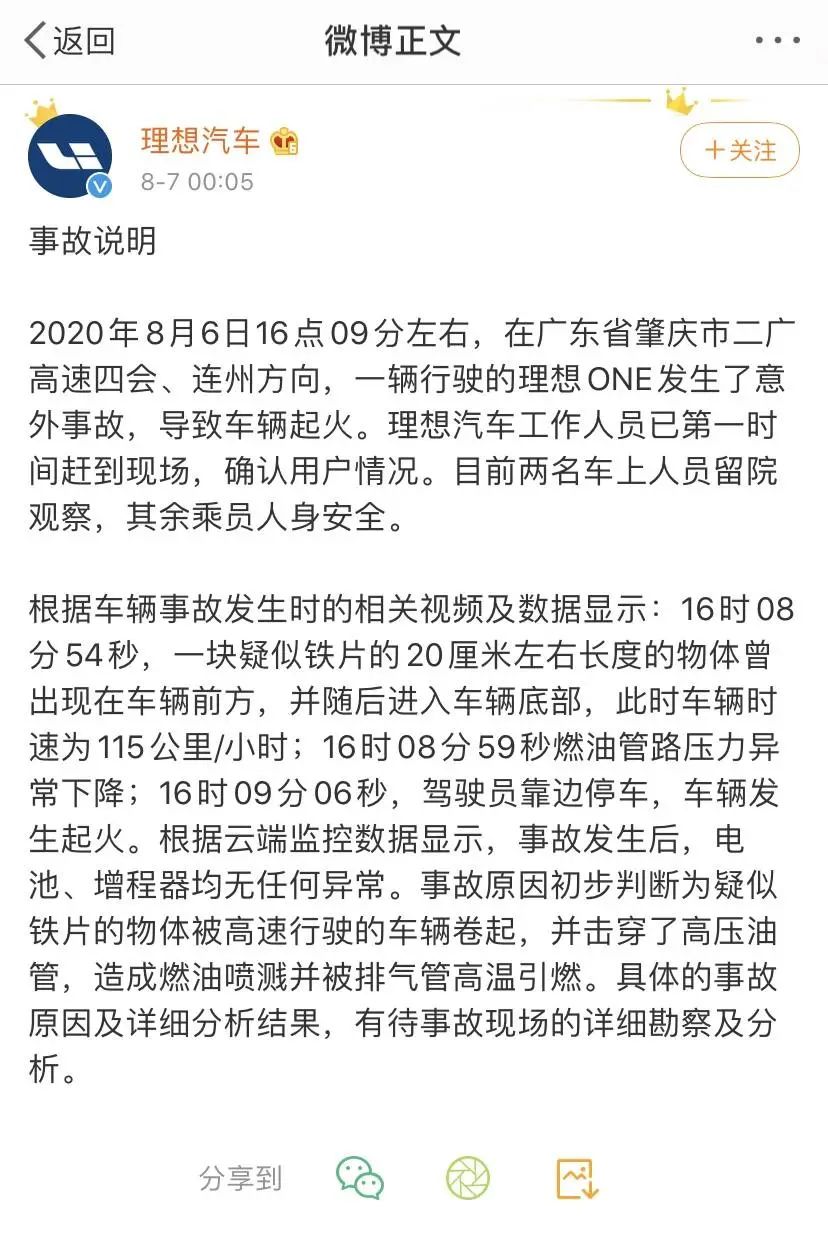 理想汽车官方回应车辆起火:疑似铁片击穿高压油管