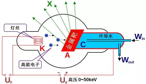 目前比较常见的产生X射线装置有两种:一种是用高能电子轰击金属,电子在打进金属的过程中急剧减速,按照大名鼎鼎的麦克斯韦方程,减速的带电粒子或者激发的金属原子会辐射电磁波,如果电子能量很大,比如上万电子伏,就可以产生X射线,这是目前实验室和工厂,医院等地方用的产生X射线的方法,该方法产生的X射线能量比较单一,同时亮度也一般比较弱;另外一种就是同步辐射装置。
